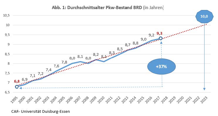 Abb. 1 illustriert, dass die Autos der Deutschen langsam zu „Oldtimer“ werden. 9,3 Jahre hat das Durchschnittsauto der Deutschen auf dem Buckel, so alt wie seit der Wende nicht. Nur in der DDR waren die Autos der Deutschen älter. Aber damals war es eher der Mangel an Autos, der dazu führte, dass der Trabbi viele Jahre auf dem Buckel hatte. Diesen Mangel gibt es heute nicht mehr. Heute sind Autos im Überfluss vorhanden.