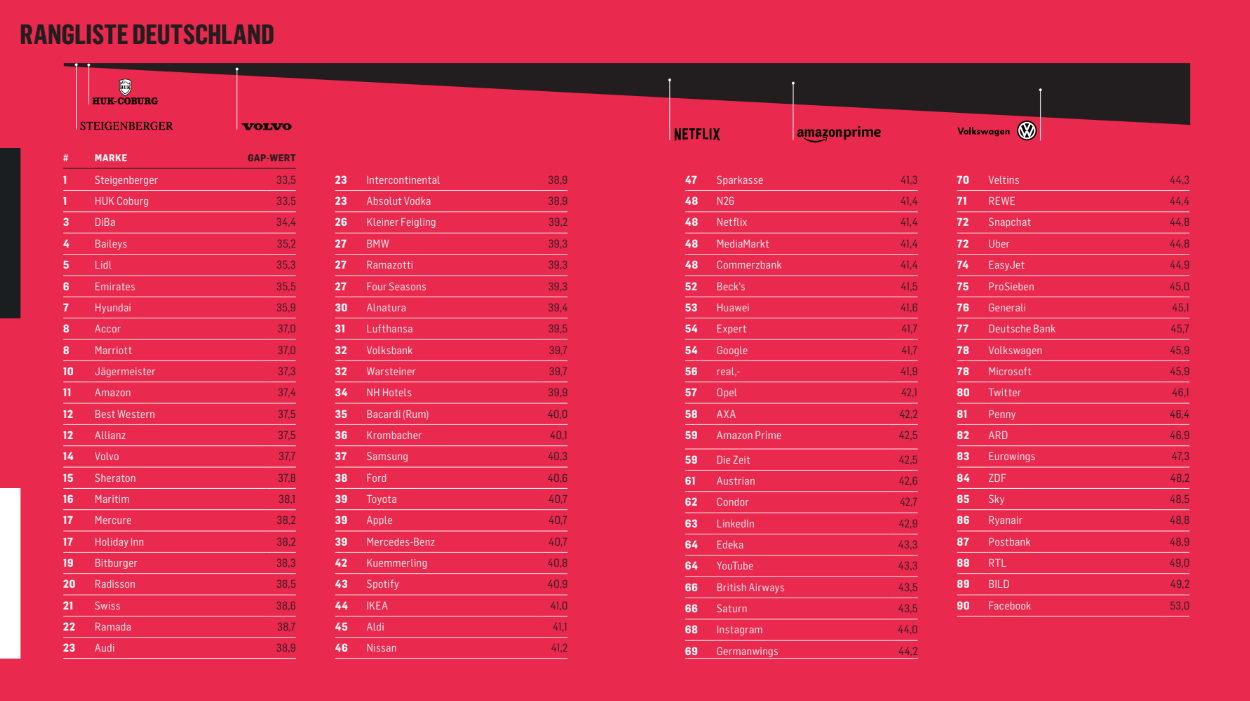 Keiner der Autohersteller ist unter den Top 20. Die Automobilmarken haben offenbar Mühe, ihre Versprechen mit dem tatsächlich gelieferten Nutzererlebnis in Einklang zu bringen. Vor allem Volkswagen kämpft darum, Versprechen wie Vertrauenswürdigkeit und geringen Kraftstoffverbrauch einzuhalten. Das zeigt, dass die Marke nach dem Dieselskandal immer noch darum kämpft, das Vertrauen wiederherzustellen. Auch keine Medienmarke schafft es unter die Top 40. Damit ist das eine der am schlechtesten abschneidenden Kategorie. BILD, RTL und ZDF haben allesamt Schwierigkeiten und keine der Marken hielt das Versprechen, informativ und ausgewogen zu sein. Das zeigt, dass die Verbraucher immer sensibler gegenüber tendenziöser Berichterstattung in den Medien sind.