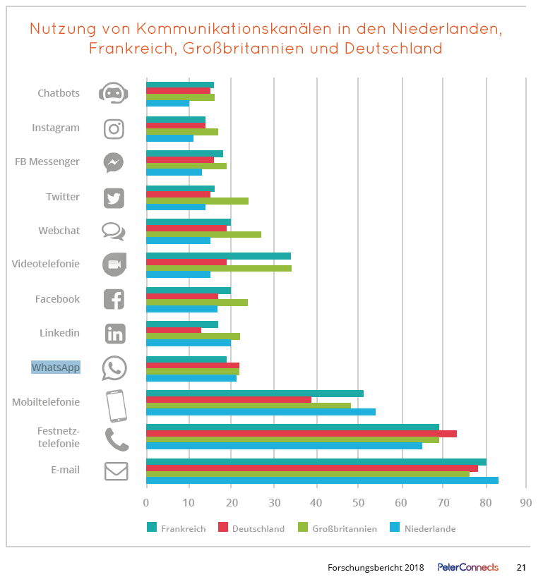 Laut der aktuellen Studie „Der Kundenkontakt-Radar“ von PeterConnects kommt WhatsApp beim Kundenkontakt immer häufiger zum Einsatz. WhatsApp nimmt in der Rangliste der am häufigsten genutzten Kommunikationskanälen mit 21 Prozent den vierten Platz ein. Auf den ersten drei Rängen stehen die klassischen Kommunkationskanäle E-Mail, Telefon und Videokonferenz. PeterConnects befragte 2649 Angestellte in Deutschland, Großbritannien, Frankreich und den Niederlanden online ̶ 535 Mitarbeiter davon aus Deutschland. Alle Teilnehmer sind im Bereich Kundenkontakt tätig, etwa als Telefonisten, Rezeptionisten oder als Mitarbeiter an Serviceschaltern.