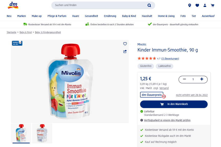 Bei dem Mixgetränk der dm-Eigenmarke Mivolis handelt es sich um eine Mischung aus Apfel-, Bananen- und Erdbeerpüree. In seiner Eigenmarkenreihe, die bis 2019 „Das gesunde Plus“ hieß, bietet die Drogeriemarktkette seit mehr als 20 Jahren verschiedene Nahrungsergänzungsprodukte aus den Bereichen Pharma und Wohlbefinden an, wie es im Onlineshop heißt.