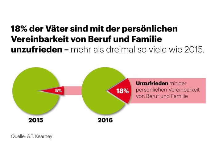 „Jetzt sind es die Väter, die uns die Missstände bei der Vereinbarkeit von Familie und Beruf aufzeigen. Spätestens wenn jeder zweite Vater einen Konflikt zwischen Familie und Karriere sieht, müssen in Unternehmen die Alarmglocken schrillen“, kommentiert Dr. Martin Sonnenschein, Initiator der Befragung und Mitglied des Global Board of Directors von A.T. Kearney. Es gibt eine stark wachsende Unzufriedenheit der heutigen Väter: 92 Prozent der befragten Väter erachten mittlerweile eine gute Vereinbarkeit von Beruf und Familie für ihr persönliches Wohlbefinden als sehr wichtig, doch nicht einmal die Hälfte findet, dass in ihren Unternehmen Beschäftigte mit Familienpflichten gute berufliche Möglichkeiten haben. Fast jeder vierte geht sogar davon aus, dass Familienpflichten zu schlechteren Chancen führen.