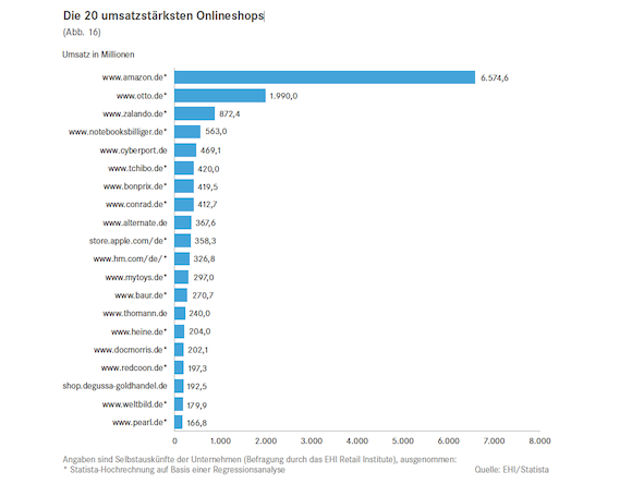 Die Analysen zu Umsatzwachstum und Marktkonzentration haben gezeigt: Nach wie vor sind vor allem die größten Onlineshops bestimmend für die Richtung, die der deutsche E-Commerce einschlägt. Wie sich Amazon.de, Zalando.de oder Otto.de entwickeln, hat allein einen großen Einfluss auf die wichtigsten Marktkennzahlen. Platzhirsch Amazon setzte ohne Markplatz und Service-Angeboten 6,6 Milliarden Euro um. Rechnet man das Marktplatz- und Service-Geschäft mit ein, kommt das US-Unternehmen in Deutschland auf 9 Milliarden Euro, weltweilt sind es 67 Milliarden Euro Gesamtumsatz im Jahr 2014. Amazons Dimension sind die Milliarden- Umsätze. In diesem Bereich spielen an deutschen Onlineshops ansonsten nur Otto.de (1,99 Mrd. Euro) und vermutlich bald Zalando.de (0,87 Mrd. Euro). Auch wenn die Konkurrenz, wie Zalando.de, mitunter schneller wächst, ist der Vorsprung des ehemaligen Bücher-Onlineshops noch gewaltig.