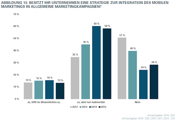 Das zentrale Ergebnis der Studie: Cross-Channel-Marketing ist in den meisten Unternehmen noch ferne Zukunftsmusik. So gaben 36 Prozent der Befragten an, „nicht wirklich“ auf effektive, abgestimmte, kanalübergreifende Marketingmaßnahmen vorbereitet zu sein. Zehn Prozent fühlen sich sogar überhaupt nicht vorbereitet. Immerhin 49 Prozent der Unternehmen sehen sich zumindest in gewissem Maße vorbereitet. Dazu haben 28 Prozent der befragten Unternehmen keine Strategie zur Integration des mobilen Kanals in übergreifende Kampagnen. Bei 58 Prozent der Unternehmen ist eine solche Strategie lediglich rudimentär vorhanden.