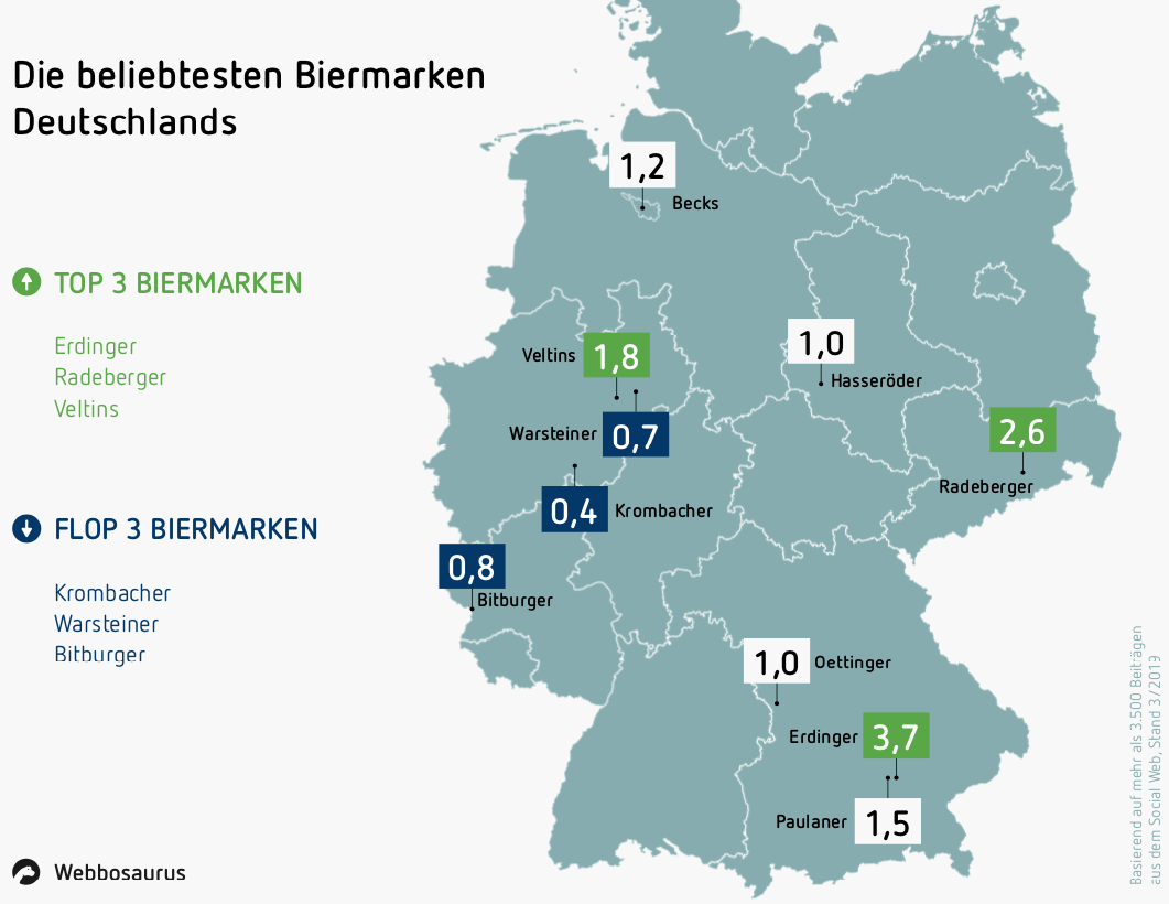 Radeberger und Erdinger sind die Marken mit dem besten Stimmungs-Index, sprich: dem Verhältnis positiver Beiträge zu negativen Beiträgen in sozialen Medien. Das ist das Ergebnis einer Studie von „Webbosaurus“, im Rahmen derer im März 2019 ingesamt 3462 relevante Bewertungen, Meinungen und Erwähnungen von Nutzern im digitalen Raum erfasst wurden. Untersucht wurden die zehn größten Brauereien in Deutschland gemessen an ihrem Bier-Ausstoß sowie 48 Craft-Beer-Brauereien. Die Beiträge stammen aus Bewertungen, Bild- und Videoplattformen, Blogs, Foren, Frage- und Antwortportalen, sozialen Netzwerken sowie Twitter.