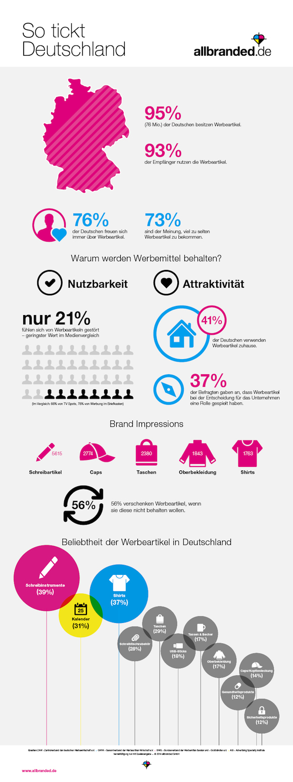 Werbeartikel sind so beliebt bei Unternehmen, weil sie bei den deutschen Kunden gut ankommen. Tatsächlich besitzen 95 Prozent der Deutschen Werbeartikel. Drei Viertel geben folgend an, dass sie sich immer über Werbeartikel freuen. Derartig positive Reaktionen auf Werbeartikel lassen sich vor allem mit ihrem haptischen Charakter begründen, denn Werbeartikel können angefasst und befühlt werden. Da sie so mehr Sinneswahrnehmung auslösen als TV-Spots oder Werbeplakate, bleibt die Botschaft auf den Werbeartikeln auch länger im Gedächtnis der Beschenkten verankert und wird mit einem positiven Erlebnis verbunden. Ihre Kunden nehmen Werbeartikel nicht unbedingt als Werbeträger war. Viel eher sehen sie in dem bedruckten Gegenstand einen Alltagshelfer, ein Geburtstagsgeschenk oder ein Dankeschön.
