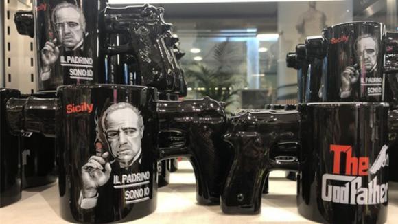 Kaffe-Becher mit dem Konterfei des US-Schauspielers Marlon Brando in der Rolle als Mafia-Boss Don Vito Corleone aus dem Mafia-Film „Der Pate“ von 1972 sind im Regal in einem Souvenir-Geschäft auf Sizilien zu sehen. dpa