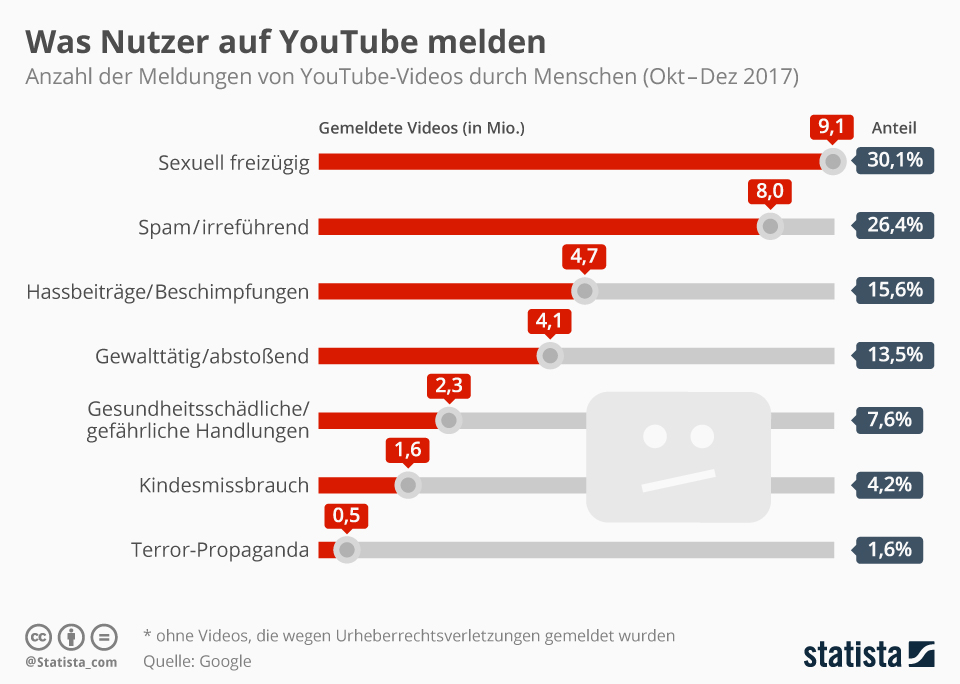 Bei den von Menschen gemeldeten Videos, die sich laut n Google-Transparenzbericht auf 9,3 Millionen beanstandete Videos belaufen, ging es in dem Quartal in 30 Prozent der Fälle um sexuell freizügige Inhalte und 27 Prozent der Meldungen verwiesen auf Clips mit Spam oder falschen Angaben. Terror-Propaganda war der Grund für 491 000 Meldungen – zwei Prozent der menschlichen Hinweise. Deutschland ist auf Platz fünf der Länder mit den meisten Meldungen von Nutzern nach Indien, den USA, Brasilien und Russland.